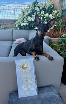 Spock is the ultimate lover girl with her people—affectionate, funny, and deeply bonded—paired with medium to high drive and strong engagement in training. She’s a true city dog who lives happily in a NYC apartment and, outside of sport time, prefers rotating between the softest possible places to nap, showing off a very real on/off switch. Like any good Manchester, she has a strong prey drive for rats but has shown very little interest in cats. In the ring, judges often comment on her beautiful head, free and flowing movement (“she really loves to move, doesn’t she”), and her less commonly seen natural ear set.